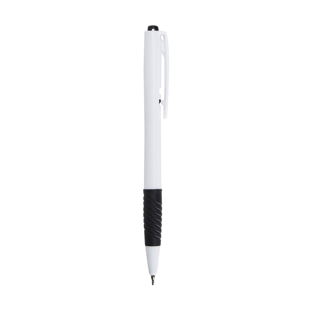 Caneta plástica com detalhe emborrachado e acionamento por clique, carga esferográfica azul 0.8mm.